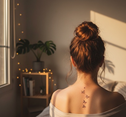 La nuque est une zone délicate, souvent associée à la douceur, à la grâce et à la féminité. Quand un motif y est posé, il peut symboliser la légèreté, la liberté intérieure ou encore la transformation personnelle.
